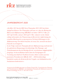 JAHRESBERICHT 2025 «Im März 2025 hat die RKZ ihren Finanzplan 2025-2028 im dritten Anlauf beschlossen. Der Finanzplan sieht nun vor, dass der Beitrag der RKZ an die Mitfinanzierung SBK|RKZ von bisher…